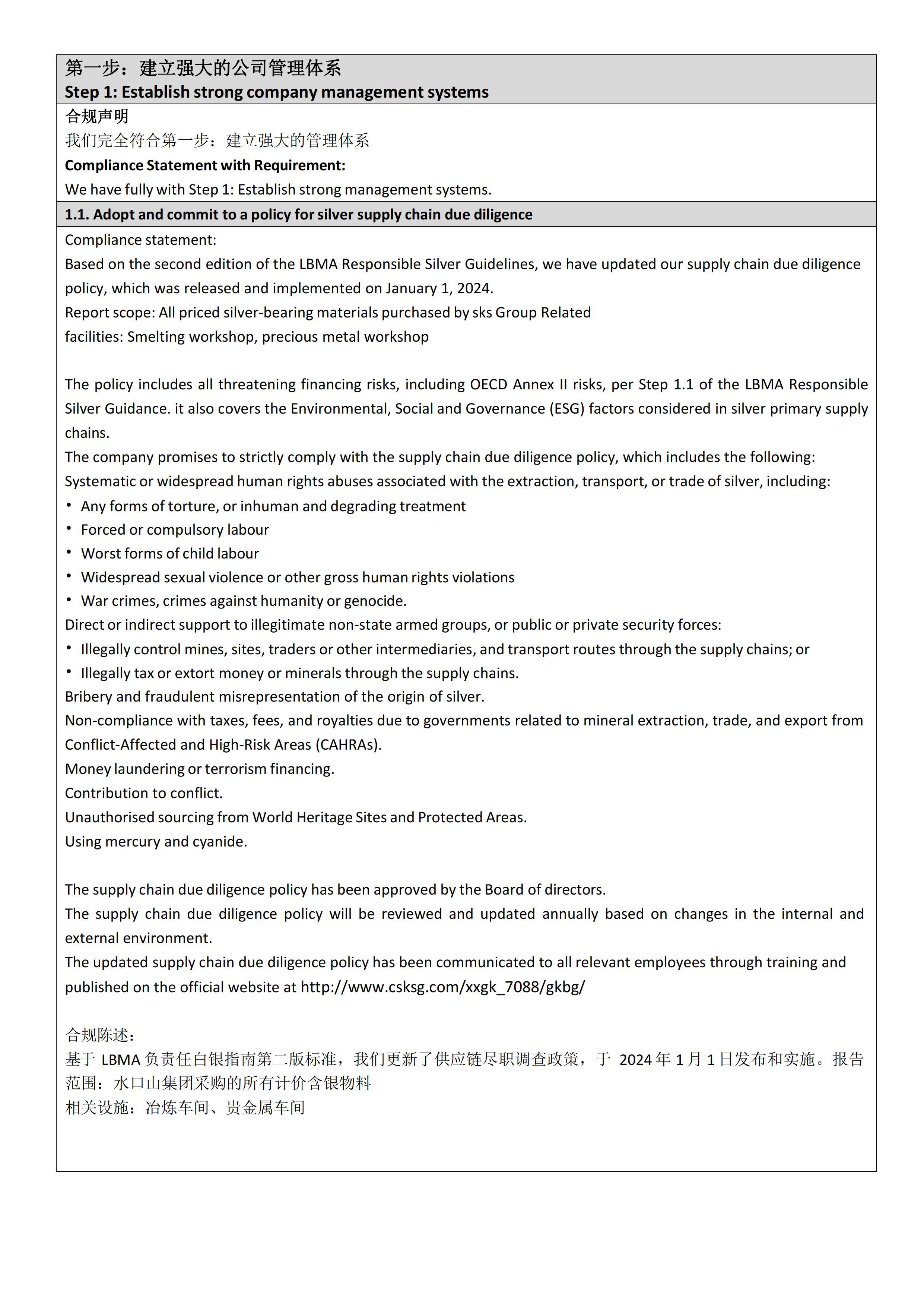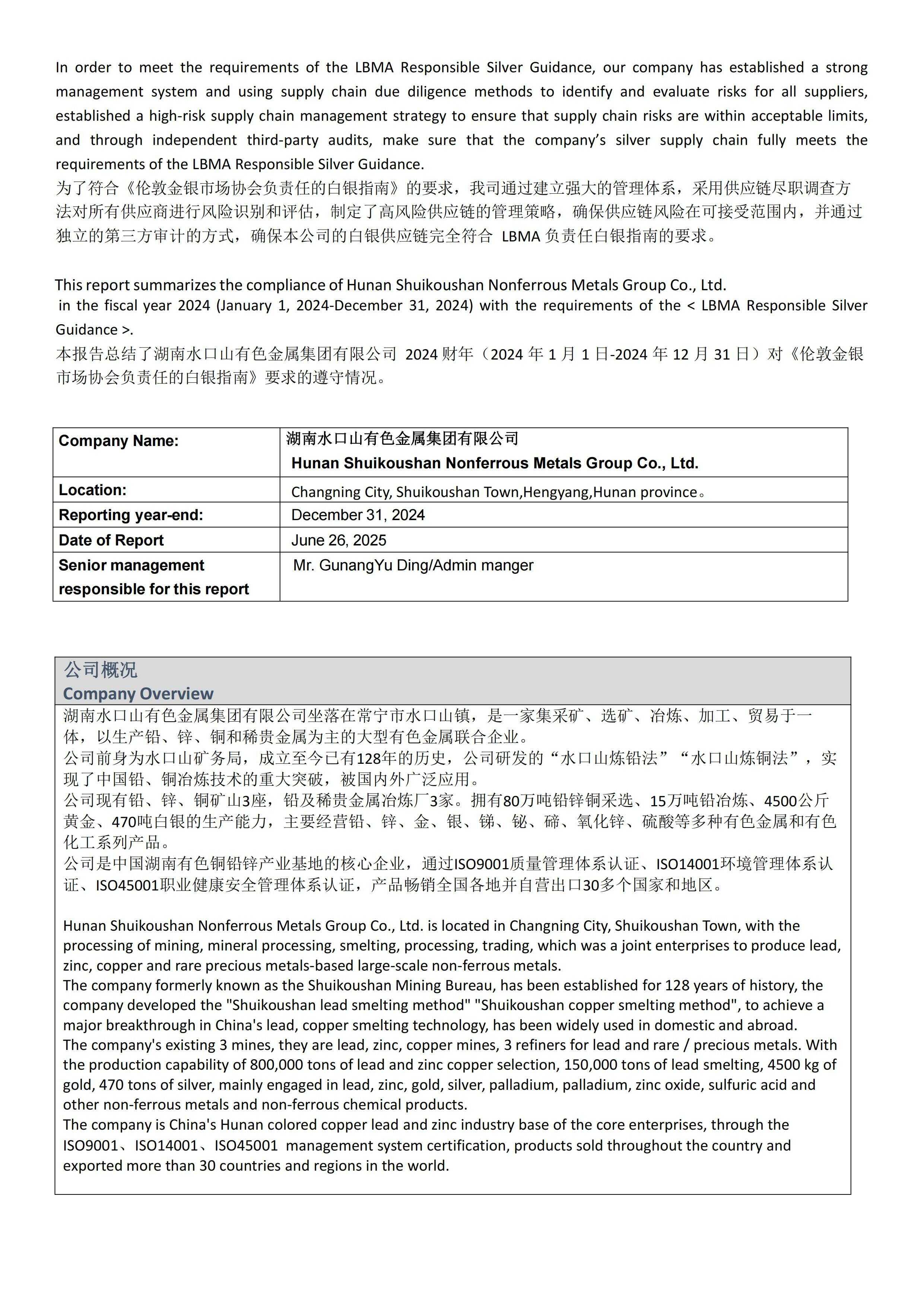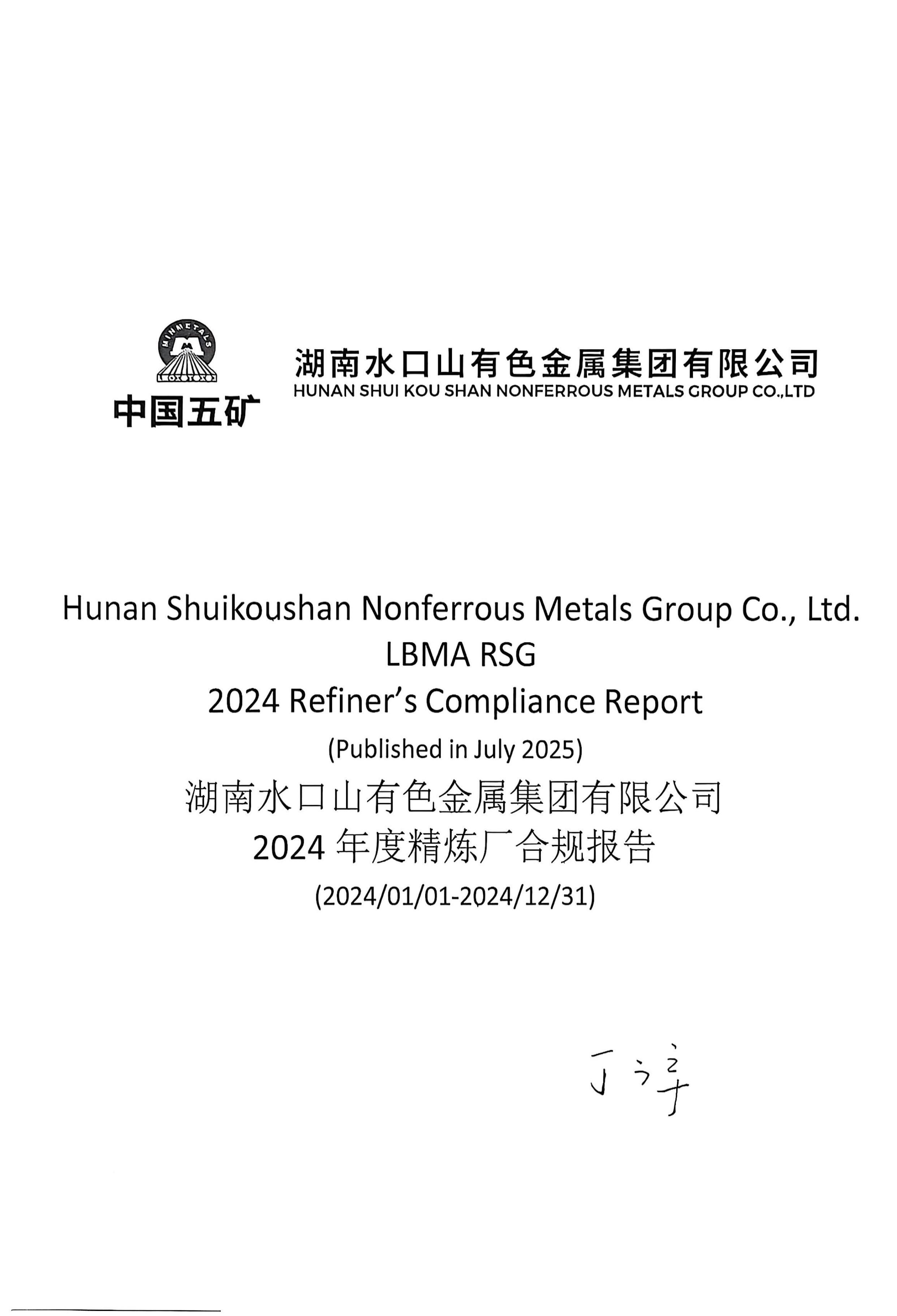 Hunan Shuikoushan Nonferrous Metals Group Co., Ltd. LBMA RSG 2024 Refiner’s Compliance Report