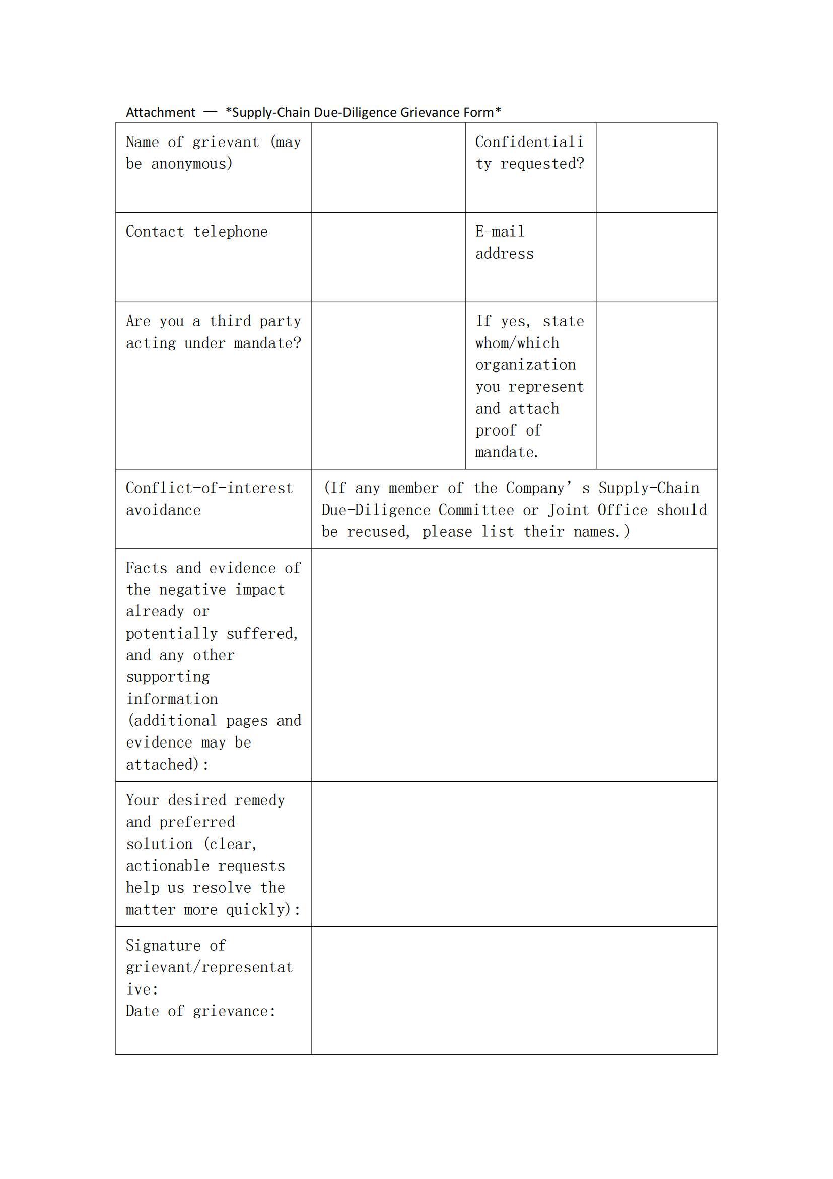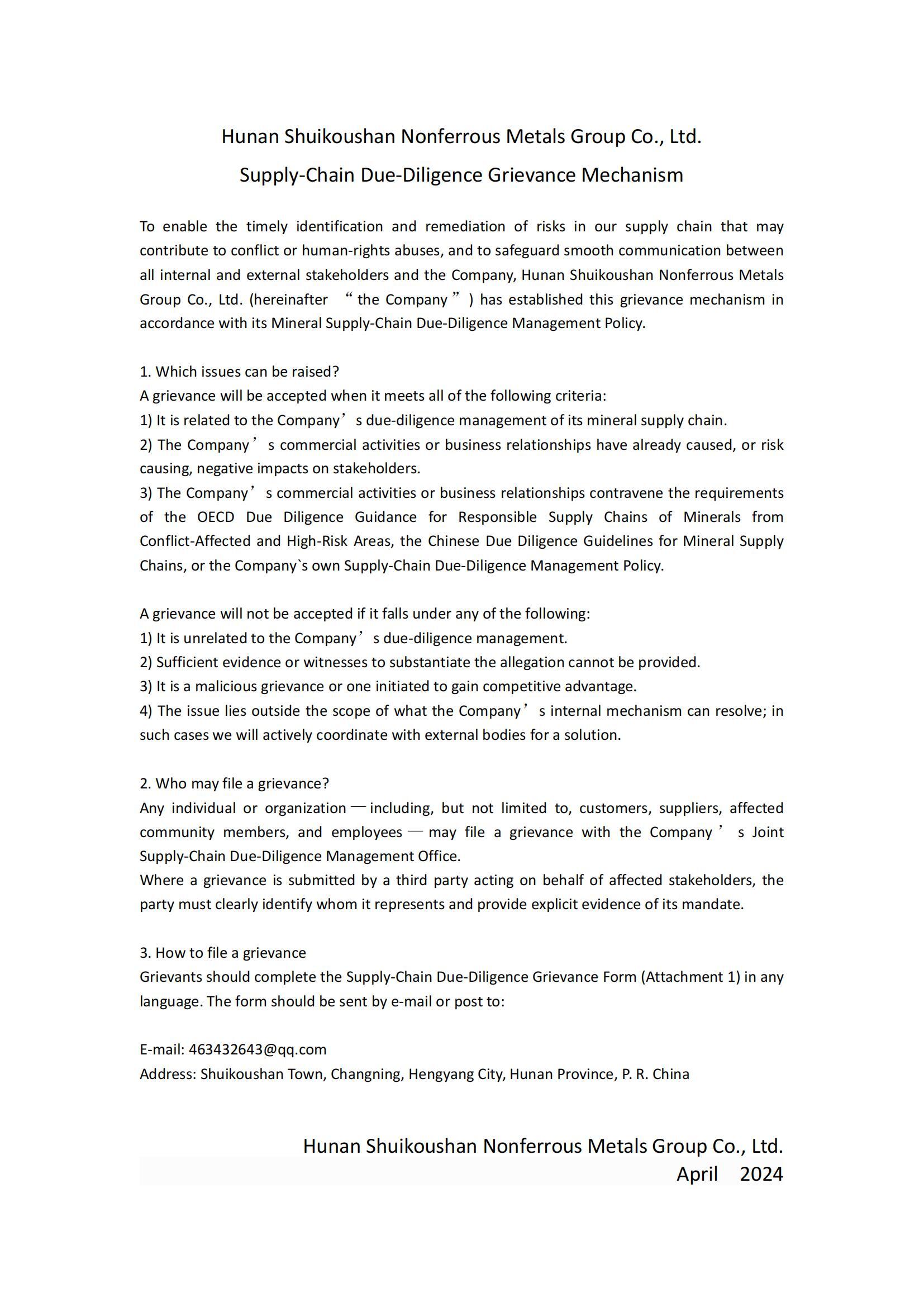 HUNAN SHUI KOU SHAN NONFERROUS METAL GROUP CO., LTD Supply-Chain Due-Diligence Grievance Mechanism